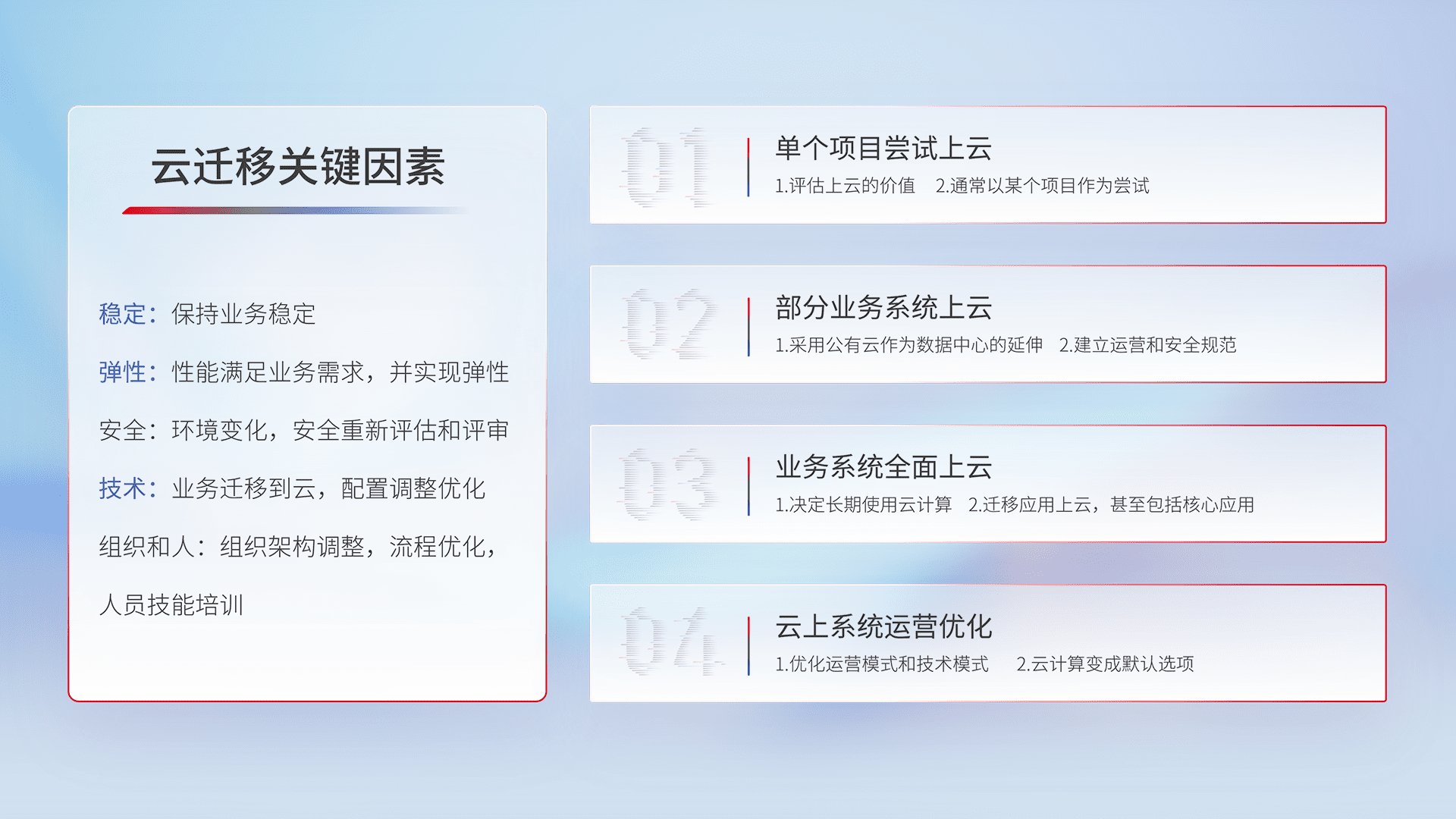 结合实际业务,,从规划设计、、、云平台选型、、、、云原生改造、、数据迁移、、、集成交付,,,迁移全过程为客户识别最佳上云路径,,做好风险识别管理,,,设计网络架构、、身份权限、、、安全审计合规、、、操作审计、、日志审计、、监控告警策略、、、多站点容灾设计等,,,对云上基础设施进行整体规划,,提升IT治理水平,,,以满足弹性、、高可用、、高性能的需求。。