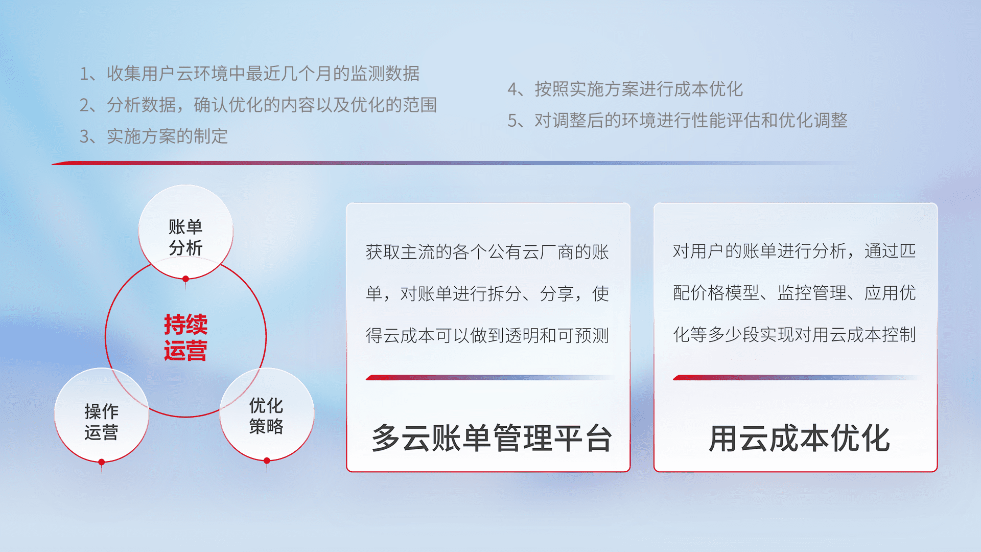通过多云纳管,,以统一的资源数据模型把客户的云资源进行抽象和封装,,进而实现对多云资源的统一操作,,,保障云资源管理的可靠性、、稳定性与可用性。。量身定制化运维内容,,,,配置、、、、开发运维、、、补丁管理、、备份、、监控、、、认证和访问管理、、、审计和日常巡检等,,保障在用云过程中的可靠度,,,,稳定度以及高可用率。。。。